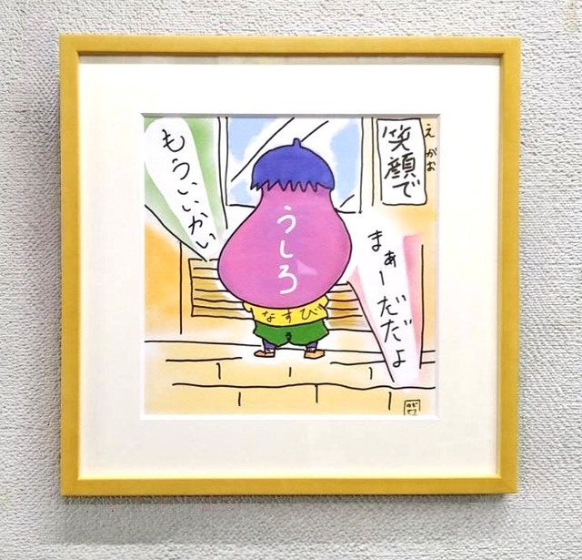 作品の裏面に直筆のサインと購入された日付を記載させて頂きます。 額縁には本物の温かみのある木材を使用しています。 2025年の西日本新聞こどもタイムズで連載されたお野菜小学生4コマ漫画『なすびくんと愉快な野菜たち』の川下り編で使用しなかった未発表作品 写真 1枚目:正面 2枚目:側面 3枚目:裏面 ◯額の種類と寸法と特徴 300角額 5767 木地 額外寸法:335×335×22ミリ UVアクリル使用 窓枠寸法:208×204ミリ マット色:オフホワイト