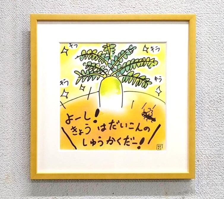 2024年12月4日に西日本新聞こどもタイムズで連載されたお野菜小学生4コマ漫画『なすびくんと愉快な野菜たち』のタイトル『だいこんとれたよ』の1コマ目の作品