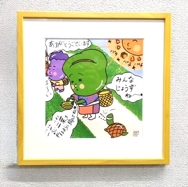 2025年5月28日に西日本新聞こどもタイムズで連載されたお野菜小学生4コマ漫画『なすびくんと愉快な野菜たち』のタイトル『お茶摘み体験』の3コマ目の作品